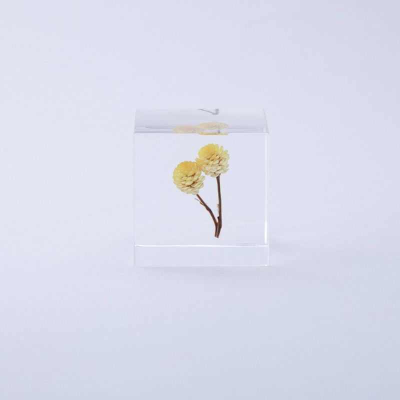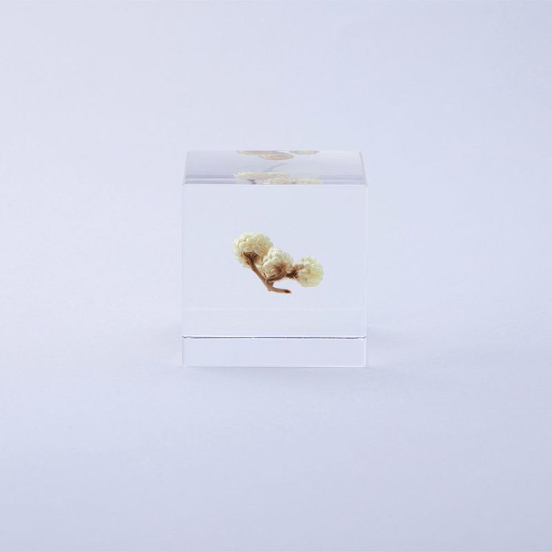 Immortelle symbolizes eternal beauty, and its golden flowers are forever captured in the Sola Cube by Usage No Nedoko. Inspired by Shiro Kuramata’s design philosophy, each handcrafted cube encases real dried plants in crystal-clear acrylic resin. A meditative piece of functional art from Kyoto, Japan.